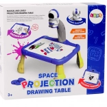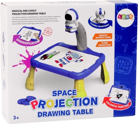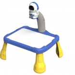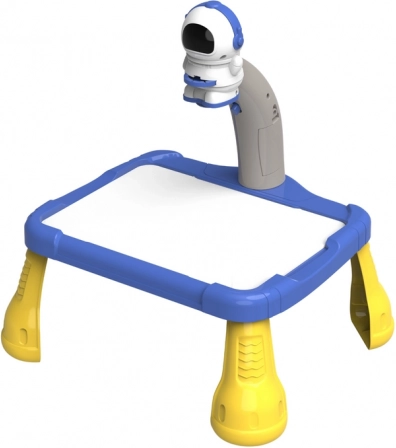 Projektor je v tvare kozmonauta a slúži na premietanie obrázkov na papier, čo deťom umožňuje ľahko sledovať a kresliť kozmické motívy ako planéty, hviezdy, rakety a kozmonautov. Stolík má stabilné žlté nohy a modrú priestrannú plochu na kreslenie.