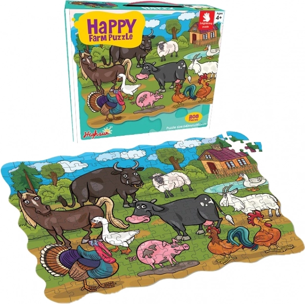 Puzzle šťastná farma poskytuje deťom kreatívnu a chytrú zábavu, keď skladajú 208 dielikov s motívom farmy a jej obyvateľov.