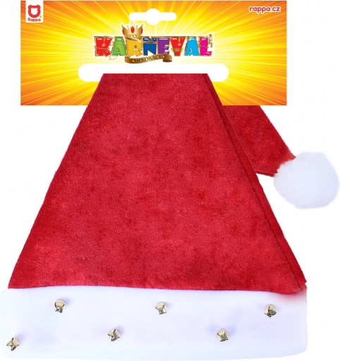 Štýlová vianočná čiapka s bielym lemovaním, zdobená rolničkami a bambulkou. Ideálna na vianočné večierky.