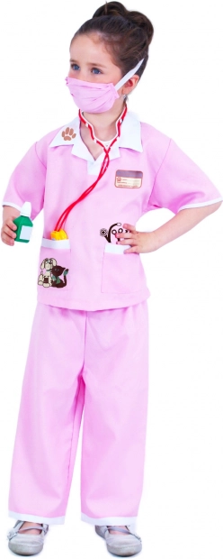 Detský kostým veterinárka v jemnej ružovej farbe so štýlovou zvieracou potlačou podporí fantáziu aj lásku k zvieratám. Kompletná sada je navrhnutá pre postavu vysokú 117–128 cm a hodí sa na karneval, maškarný ples aj domáce hranie.