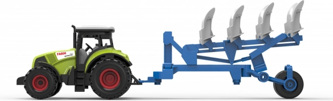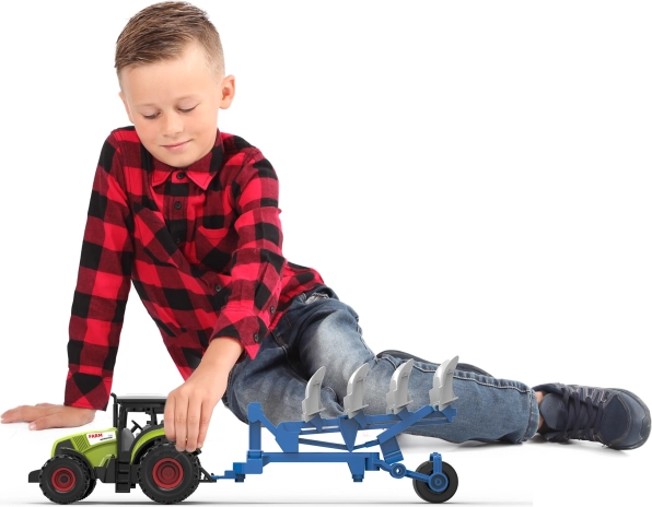 Jazdu zabezpečuje zotrvačník, takže sa traktor ľahko rozbehne ľahkým postrčením. Celková dĺžka súpravy je 37 cm, čo zaručuje stabilitu a pohodlné ovládanie malými detskými rukami. Batérie sú v balení, takže si deti môžu začať hrať hneď po rozbalení.
