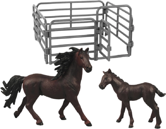 Obohaťte svoju zbierku hračiek touto krásnou súpravou koní s ohradou. Figúrka koňa a žriebäťa pôsobí realisticky a svojim spracovaním poteší všetky vekové kategórie. Balenie obsahuje: