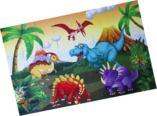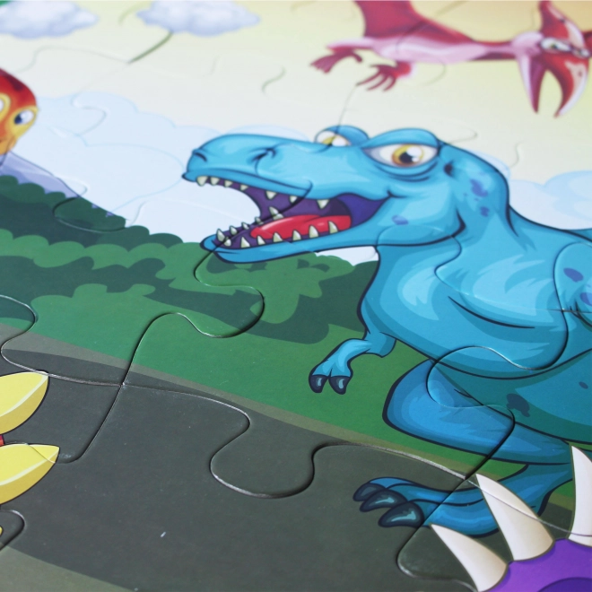 Podlahové puzzle s motívom dinosaurov pre deti od 3 rokov, obsahuje 48 veľkých dielov pre jednoduché zloženie. Výsledný obrázok má veľkosť 92 x 62 cm.