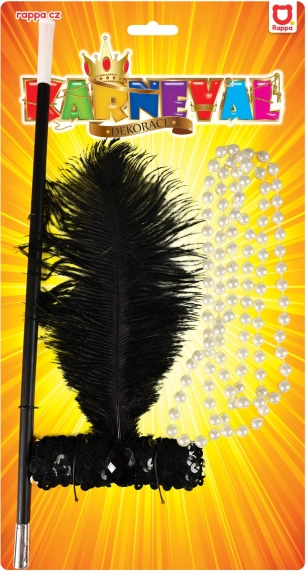 Očarujúca súprava pre tanečnice. Set obsahuje čelenku s perím, korále a cigaretovú špičku. Perfektný doplnok na karneval alebo párty!