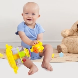 Pestrofarebný kolotoč v tvare žirafy zabaví aj tých najmenších: po stlačení hlavy sa farebné guličky roztočia, poskakujú a vydávajú hrkajúci zvuk. Jednoduché mechanické ovládanie bez batérií podporuje rozvoj jemnej motoriky a koordináciu oko‑ruka.