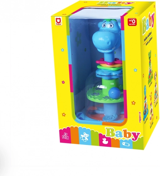 Pestrofarebná hračka v tvare dinosaura, ktorá po stlačení hlavy rozhýbe farebné guľôčky – tie sa otáčajú sa, skáču a vydávajú chrastivý zvuk. Skvelá zábava pre najmenšie deti.
