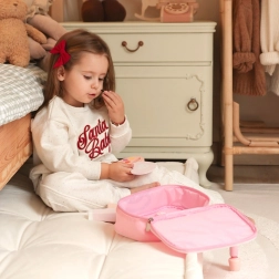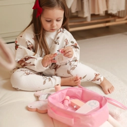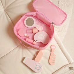 Táto detská kozmetická sada v roztomilej ružovej taštičke ponúkne až 12 starostlivo spracovaných drevených doplnkov. Deti sa môžu „líčiť“, česať aj „fúkať“ vlasy a napodobňovať dospelých spôsobom, ktorý je úplne bezpečný a plný fantázie. Vďaka kompaktným rozmerom je set ideálny na doma aj na cesty.
