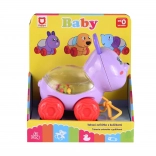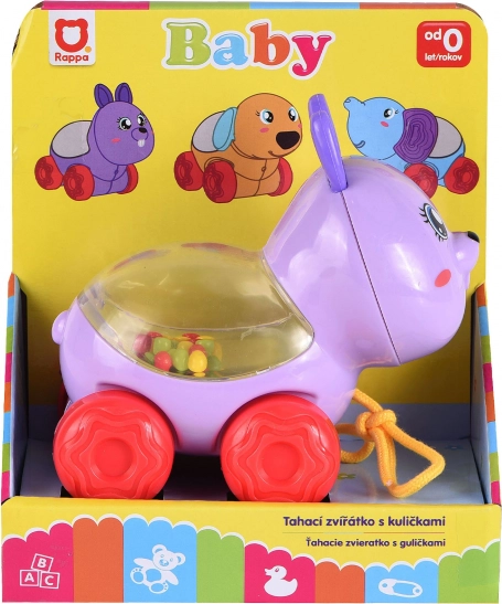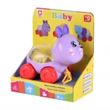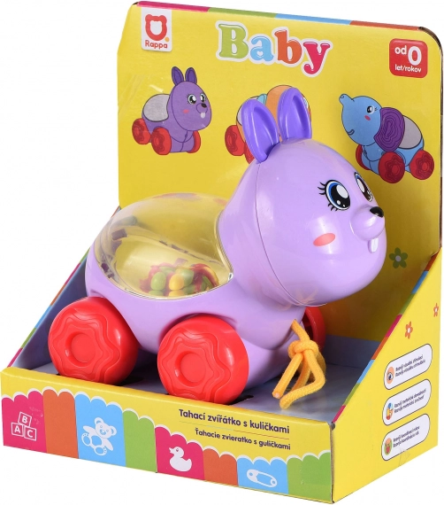 Roztomilý ťahací zajačik na kolieskach s farebnými guľôčkami, ktoré pri pohybe veselo poskakujú. Ideálna hračka pre prvé krôčiky a rozvoj motoriky – zaujme, pobaví a podporí aktívnu hru.