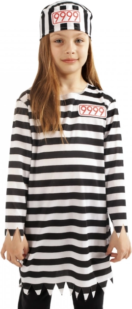 Klasický čierno‑biely prúžok a číslo väzňa na čiapke aj hornom diele okamžite vytvoria efektný a zábavný prevlek.