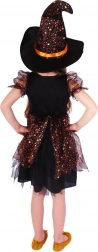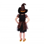 Kostým zahŕňa čierne šaty s nadýchanou sukňou zdobenou oranžovými prvkami a saténovou stuhou, ktoré dodávajú čarovný vzhľad.