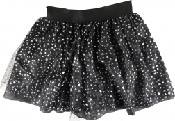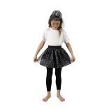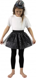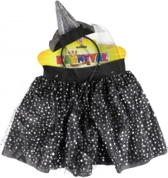 Skvelá súprava pre všetky malé parádnice – čarodejnice! Suknička má čiernu spodničku prekrytú tylom s potlačou strieborných hviezdičiek. Je určená pre dievčatká vo veku 3–7 rokov. Dĺžka sukne je 28 cm. Set je doplnený o čelenku s klobúčikom, ktorý skvele ladí k sukni. Výborne sa hodí aj na oslavu Halloweenu alebo karneval!