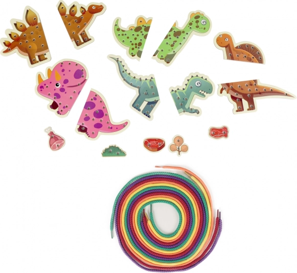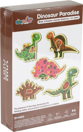 Sada obsahuje päťdielny set dinosaurov a päť odolných šnúrok, ktoré padnú do detskej ruky. Prevliekanie je tiché, bezpečné a vhodné na cesty aj do škôlky. Hračka podporuje logické myslenie, vytrvalosť a samostatnosť.