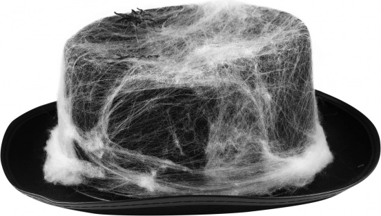Biela umelá pavučina na čiernom klobúku vytvára výrazný kontrast a pôsobí realisticky – ideálne na Halloween a hororové motívy.