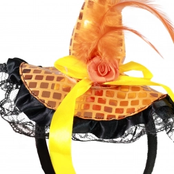 Štýlová čelenka s mini klobúčikom v oranžovej farbe a s čiernou čipkou je perfektnou voľbou na párty, karneval aj oslavy čarodejníc alebo Halloweenu. Tento výrazný doplnok dodá vášmu kostýmu šmrnc a podčiarkne vašu osobitosť. Ľahká, pohodlná na nosenie a okamžite neprehliadnuteľná.