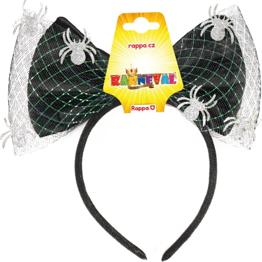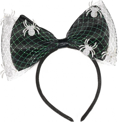 Senzačná čelenka s veľkou mašľou a pavúčikmi, ideálna ako doplnok na párty alebo karneval.