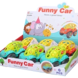 Roztomilé plastové auto hrkálka pre najmenšie deti zaujme veselými farbami, ľahkou konštrukciou a príjemným hrkajúcim zvukom, ktorý bábätko upokojí a podporí jeho zmyslový rozvoj.