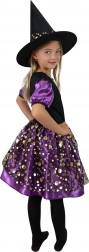 Doprajte svojej malej čarodejnici nezabudnuteľný zážitok s kostýmom, ktorý zaujme na prvý pohľad. Fialovo‑čierne šaty so zlatou potlačou a nafukovanými rukávmi krásne vyniknú na každej párty. Súčasťou je aj štýlový čarodejnícky klobúk, ktorý celý outfit dokonale doplní.
