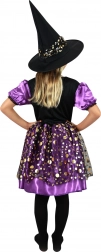 Premeňte svoju dievčinku na malú hviezdu každého Halloweenu či karnevalu. Elegantné fialovo‑čierne šaty so zlatými bodkami a decentnými detailmi čarovne vyniknú na fotografiách aj na parkete. Súčasťou je aj ladiaci špicatý klobúk, vďaka ktorému je outfit kompletný behom chvíľky.