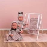 Bábika je oblečená do štýlového overalu so zapínaním na chrbte na suchý zips, doplneného čiapočkou a papučkami v rovnakom dizajne. Má nemrkvacie modré akrylové oči a nalepené riasy, bez vláskov – ideálne na jednoduchú údržbu. Produkt spĺňa európske bezpečnostné normy (CE) a je balený v darčekovej krabici, takže je pripravený na okamžité venovanie.