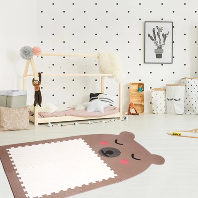 Dizajnová puzzle podlaha v tvare medvedíka v hnedej farbe s bielym bruškom prinesie do detskej izby zábavu a útulnosť. Skvele sa hodí pre deti na hranie a zároveň im poskytne pohodlnú a mäkkú podložku. Jednoduchá údržba a bezpečnosť sú kľúčové vlastnosti tohto produktu.
