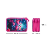 Tento trojpodlažný školský peračník s tropickým motívom plameniakov a farebnými listami ponúka nielen štýl, ale hlavne funkčnosť pre organizovanie všetkých vašich písacích potrieb. Každá priehradka využíva spoľahlivé značkové zipsy YKK a zosilnený chrbát uľahčuje manipuláciu pri zatváraní.