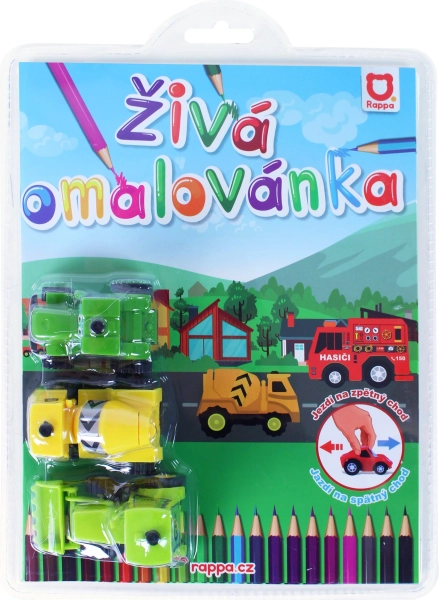 Unikátna kreatívna sada, ktorá spája vyfarbovanie a hru: vyfarbi omaľovánky so stavebnými strojmi a potom si uži jazdu s 3 mini autíčkami na spätný chod. Obsahuje omaľovánky so stavebnými autami a prináša zábavu bez obrazovky pre malých milovníkov techniky.