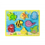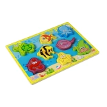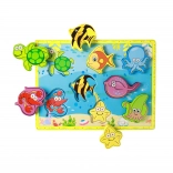 Objavte čaro podmorského sveta s touto kvalitnou drevenou vkladačkou pre najmenších. Farebné dieliky morských zvieratiek podporujú spoznávanie tvarov a farieb, rozvíjajú jemnú motoriku a koordináciu oko–ruka, zatiaľ čo dieťa zábavnou formou trénuje sústredenie a logické myslenie.