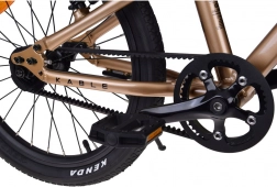 Srdcom bicykla je remeňový pohon POWERGRIP HTD – tichý, čistý a bez potreby mazania. Dvojité hliníkové ráfiky so zapletaním 20 špicov a plášte Kenda 16×1,75" dodávajú stabilitu na rôznom povrchu, zatiaľ čo V‑brzdy s detskými pákami zaistia isté zastavenie.