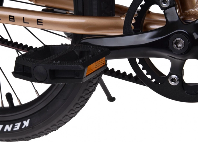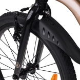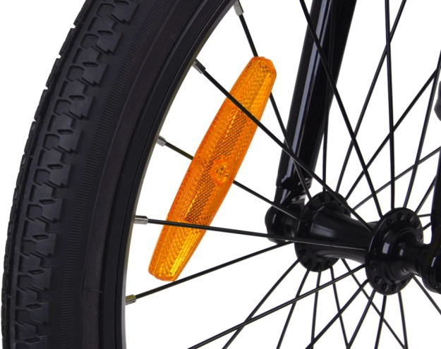 Pre bezpečnú jazdu bicykel používa V-brzdy s detskými pákami, oranžové bowdeny pre lepší prehľad o ovládaní a reflektory vpredu, vzadu aj v kolesách pre vyššiu viditeľnosť. Dvojito zosilnené ráfiky, náboje s ložiskami a plášte KENDA 18 × 1.75 sa postarajú o istý záber a pohodlie na rôznych povrchoch. Súčasťou je aj praktický stojan, blatníky a zvonček.