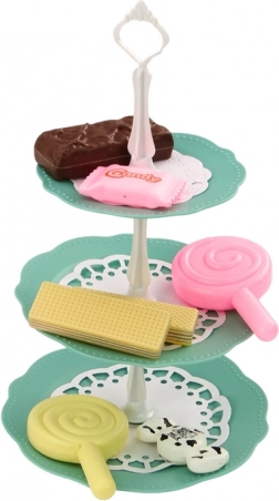 Elegantná tyrkysová patera s tromi poschodiami umožní krásne vystaviť všetky dezerty a dodá hre čaro skutočnej cukrárne.