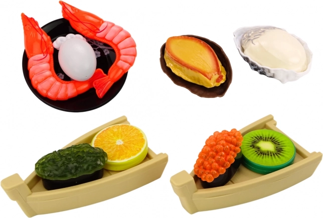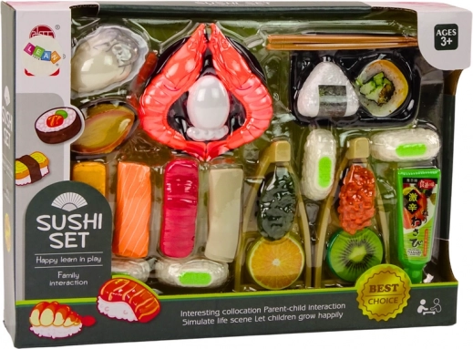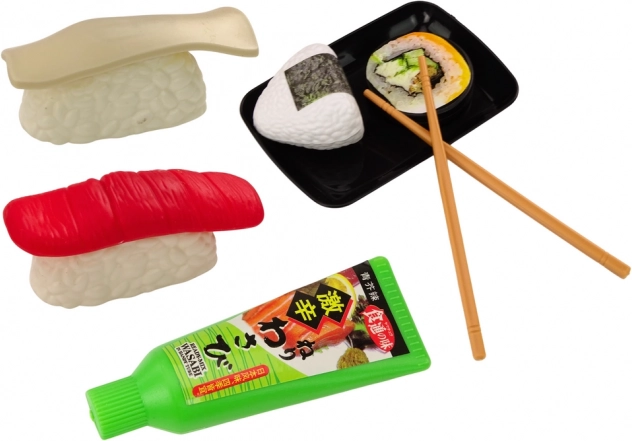 Súprava hračiek pre deti, ktorá zavedie najmenších do čarovného sveta prípravy a servírovania lahodného sushi. Sada obsahuje rôzne ingrediencie potrebné na prípravu chutného sushi. Patrí medzi ne kreveta, losos, wasabi, ryža, riasa nori a paličky na sushi.