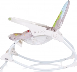 Praktická výbava zahŕňa odnímateľný plastový pult na desiatu či hranie a 3-bodové bezpečnostné pásy pre maximálnu istotu. Hojdanie možno jednoducho zablokovať pre stabilné sedenie. Kresielko je vhodné pre deti do 9 kg, neskôr poslúži ako stolička pre samostatne sediace deti až do 18 kg. Výrobok spĺňa európsku normu EN 12790.