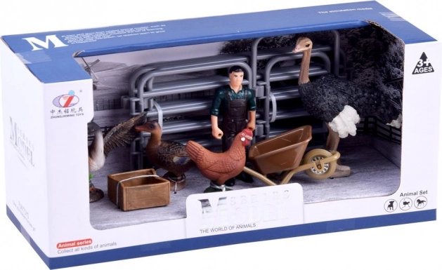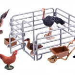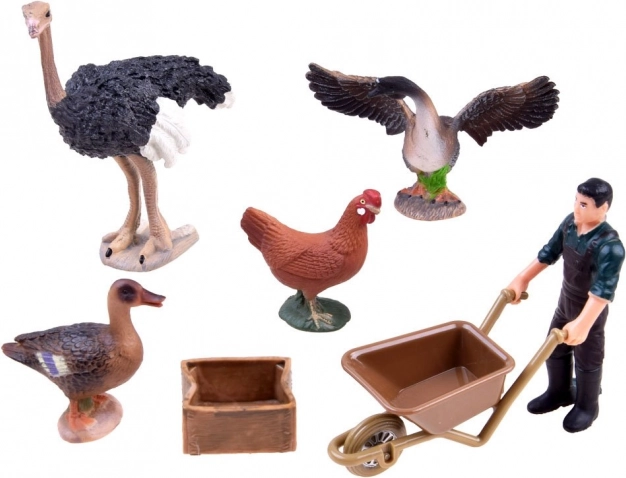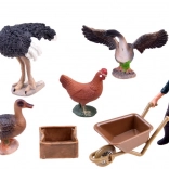V balení nájdete výrazného pštrosa, klasickú dvorovú hydinu – sliepku, hus a kačicu, postavičku farmára s fúrikom a prvky ohrady na tvorbu vlastnej mini farmy. Vďaka variabilným doplnkom možno jednoducho stavať scénky a rozvíjať znalosti o chove zvierat.