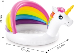 Roztomilý nafukovací bazénik v tvare jednorožca s dúhovou strieškou od značky INTEX poteší najmenších milovníkov vody. Ponúka mäkké nafukovacie dno pre pohodlie, odolný vinyl 0,25 mm pre bezpečie a kompaktné rozmery 127 × 102 × 69 cm. Vďaka strieške poskytuje príjemný tieň a s objemom 45 l je ideálny pre deti 1–3 roky (iba pod dohľadom dospelej osoby).