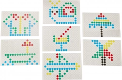 Súčasťou je 7 kariet s predlohami, ktoré deťom pomôžu vytvárať obrázky krok za krokom a zároveň podporia rozpoznávanie farieb a vzorov.