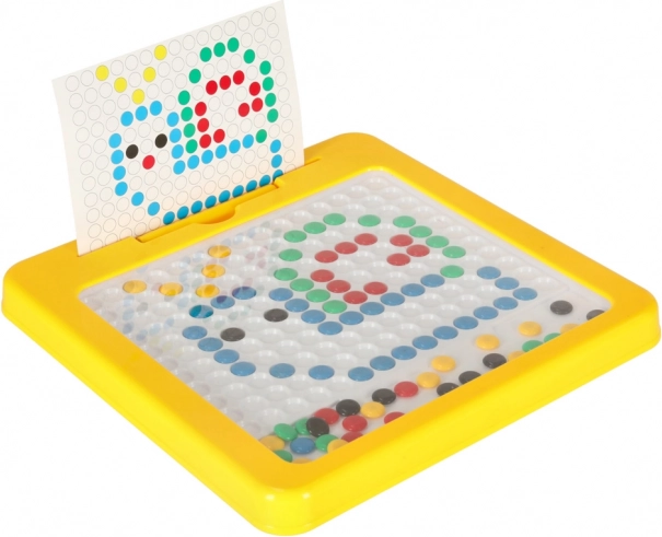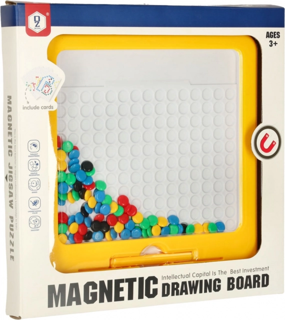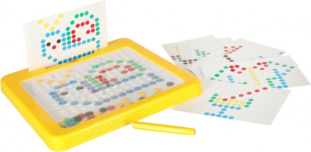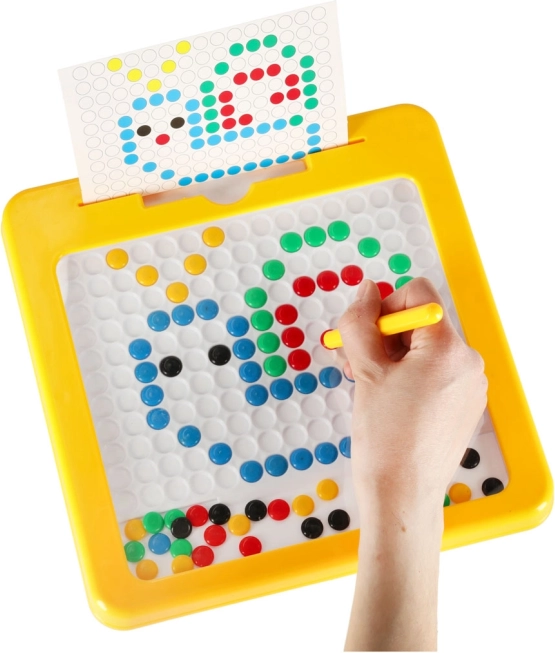 Magnetická kresliaca tabuľa s mozaikou je skvelá didaktická pomôcka inšpirovaná Montessori princípmi. Deti pomocou magnetického pera priťahujú a presúvajú farebné „gombíky“ v doske a skladajú z nich jednoduché aj zložitejšie motívy. Súčasťou sú predlohové karty, ktoré uľahčia začiatky a dodajú inšpiráciu.