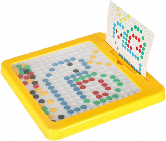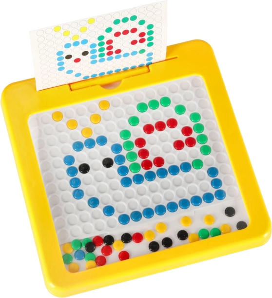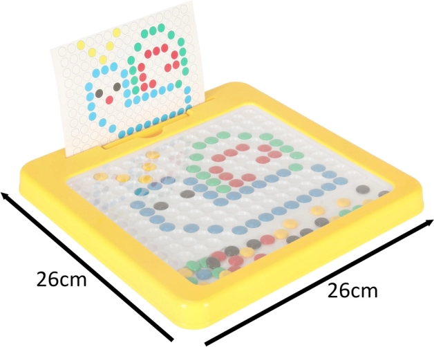 Stabilný plastový rám v žiarivo žltej farbe a kompaktné rozmery zabezpečujú pohodlné používanie doma aj na cestách. Mozaika prirodzene rozvíja kreativitu, jemnú motoriku, logické myslenie a vizuálne vnímanie. Spoločné tvorenie je zároveň skvelou aktivitou pre rodinné chvíle.