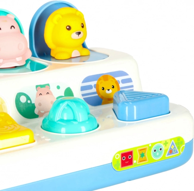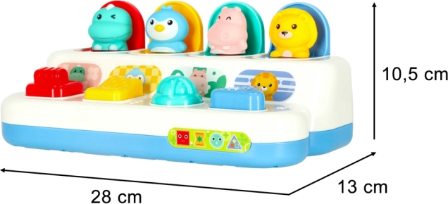 Farebné panely ukrývajú krokodíla, tučniaka, hrocha a leva. Po stlačení či posunutí ovládača zvieratko vyskočí a ozve sa uspokojivé „klik“.