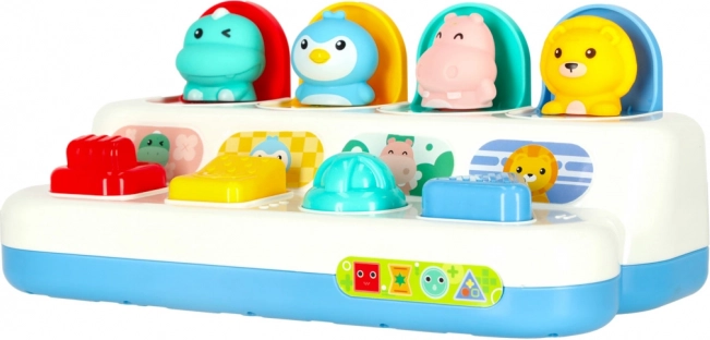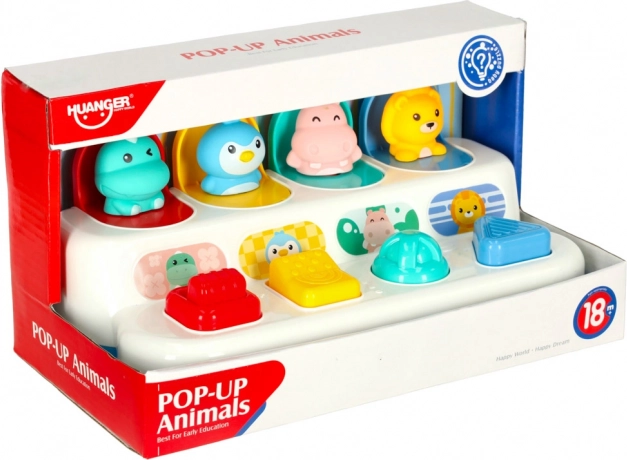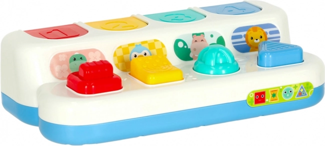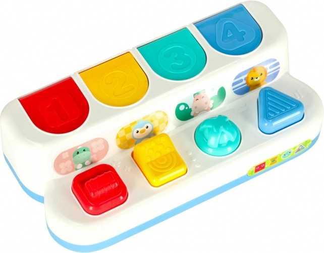 Táto interaktívna pop‑up hračka spája učenie s hrou. Deti objavujú farby, tvary a čísla, zároveň si precvičujú sústredenie a logické myslenie. Každý panel má iný mechanizmus – stlačenie, posunutie alebo otočenie – a po správnej akcii vyskočí roztomilé zvieratko. Charakteristické „klik“ podporuje sluchové vnímanie.