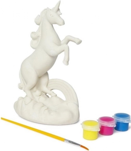 Kreatívna sada na výrobu záhradnej dekorácie v tvare jednorožca obsahuje figúrku, farby a štetce. Jednorožec je navrhnutý tak, aby vďaka svojmu matnému povrchu ľahko prijímal farby a je dostatočne pevný, aby odolal poveternostným podmienkam.