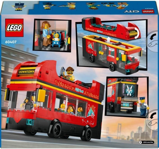 Červený poschodový autobus zo série LEGO City prináša deťom autentickú zábavu na dvoch palubách. Otočte tabuľu s cieľom cesty a vyrazte do prístavu, do centra, do múzea alebo do parku. Vďaka piatim minifigúrkam vrátane bábätka v kočíku a doplnkom, ako je mikrofón, telefón a fotoaparát, je role-play ešte bohatší.