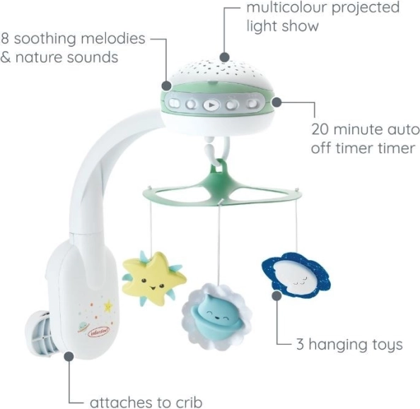 Upokojte bábätko jemným svetlom, pohybom a hudbou. Tento 3v1 projektorový hudobný kolotoč INFANTINO premieta farebné hviezdičky, prehráva 6 melódií a 2 zvuky prírody a po 20 minútach sa automaticky stíši. Vďaka chytrému zvukovému senzoru sa do 120 minút pri zvuku opäť spustí, aby pomohol bábätku znovu zaspať.