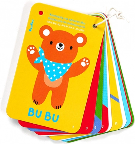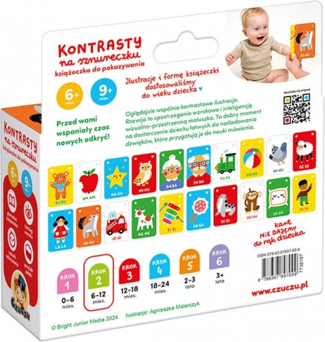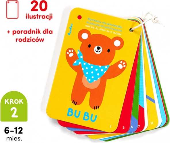 Objavujte svet s bábätkom vďaka kontrastnej knižke CzuCzu na šnúrke. Vysoký kontrast ilustrácií stimuluje zrak, podporuje rozvoj reči a sústredenie. Vďaka praktickým dierkam a šnúrke ju ľahko pripevníte nad postieľku alebo vezmete so sebou na cesty.