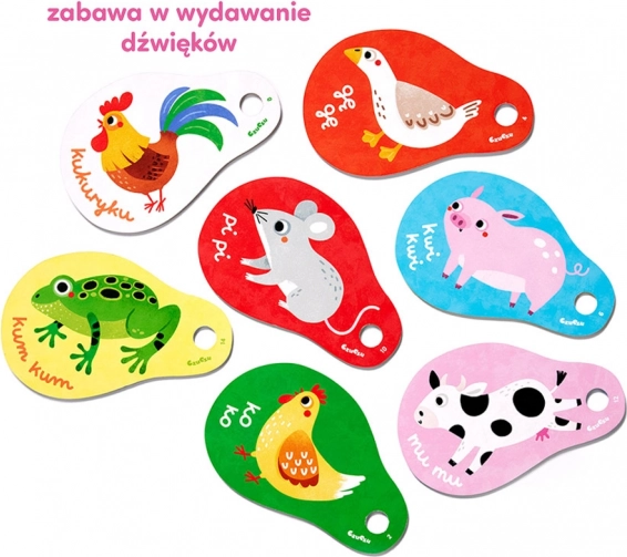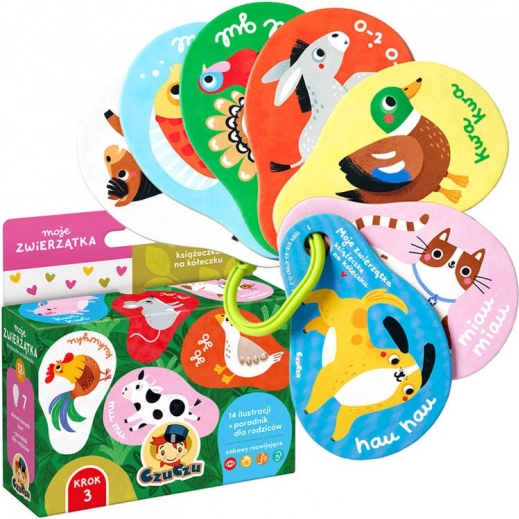 Objavujte svet zvieratiek s chytrou knižkou na krúžku od CzuCzu pre deti od 12 mesiacov. Krátke texty, krásne ilustrácie a pevné kartičky podporujú rozvoj reči, zrakového vnímania aj jemnej motoriky. Praktický krúžok na zavesenie je ideálny na kočík či do postieľky.