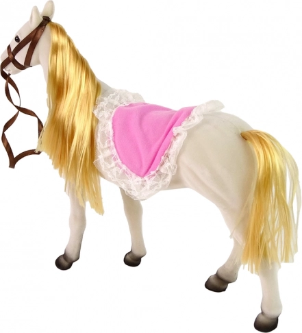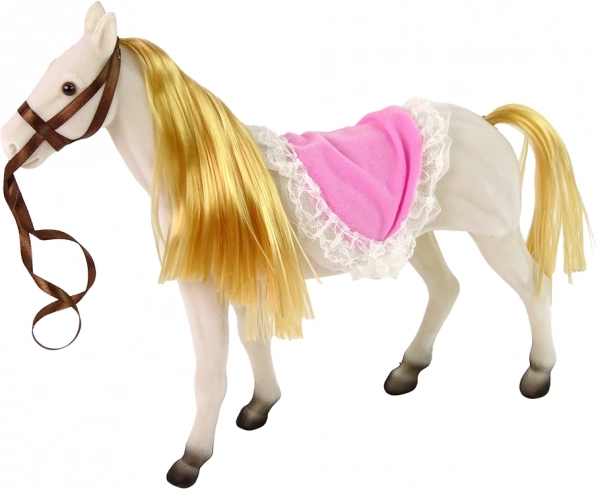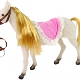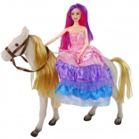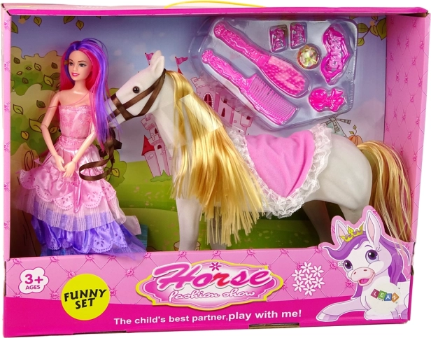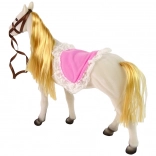 Set obsahuje bábku princeznú s ohýbateľnými končatinami a bieleho koňa, ktorý je vyrobený z príjemného materiálu pre reálny vzhľad.