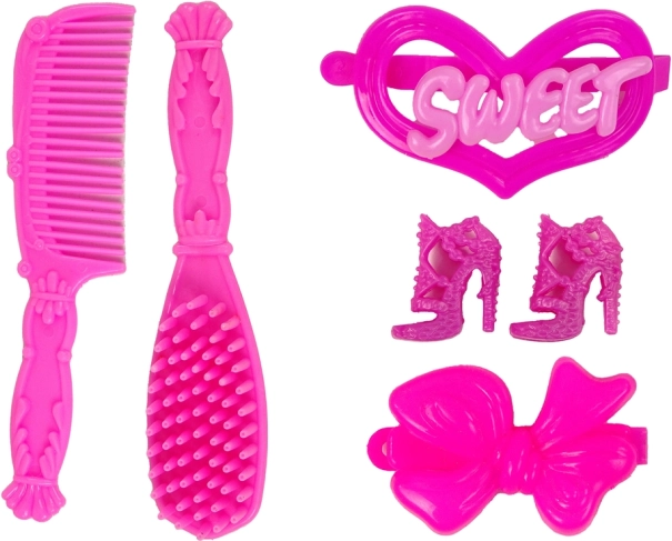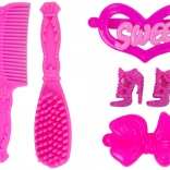 Set zahŕňa ružový hrebeň, kefu a ďalšie stylingové doplnky, ktoré podporujú starostlivosť a kreativitu pri hraní.