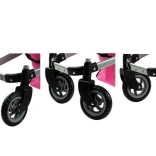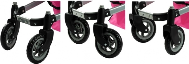 Dve väčšie zadné kolesá a dve menšie predné otočné 360° uľahčujú riadenie aj manévrovanie v interiéri i vonku. Polohovateľná rukoväť prispôsobí kočík rôzne vysokým deťom a sklopná strieška s pripínacím nánožníkom ochráni bábiku pred vetrom a slnkom. Textílie ľahké na údržbu a mäkké penové madlo zvyšujú pohodlie pri každodennej hre.