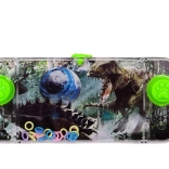Objavte klasickú vodnú hru v modernom šate so stegosaurom. Obdĺžnikové telo sa pohodlne drží v ruke, priehľadná nádržka s vodou ukrýva farebné krúžky a dva cieľové tŕne. Stlačením zelených tlačidiel vytvoríte prúd vody, ktorý vynáša krúžky nahor. Vašou úlohou je presne mieriť a nasadiť krúžky na tŕne.