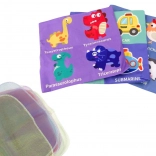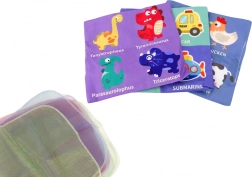 Vo vnútri krabičky sú tri šuštiace obaly s rôznymi motívmi od dinosaurov po dopravné prostriedky. Tento doplnkový prvok stimuluje hmat a sluch a podnecuje dieťa k skúmaniu a objavovaniu. Prítomnosť šuštiacich vreckoviek im navyše umožňuje učiť sa rozpoznávať zvuky.