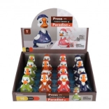 Káčer na zotrvačník prináša jednoduchú a chytľavú zábavu: stlač hlavu a sleduj, ako sa vďaka zotrvačníkovému mechanizmu rozbehne vpred. Odolný plast, hladké hrany a kompaktné rozmery 7 × 9 × 5 cm sú zárukou bezpečnej hry aj ľahkého uchopenia malými detskými rukami.
